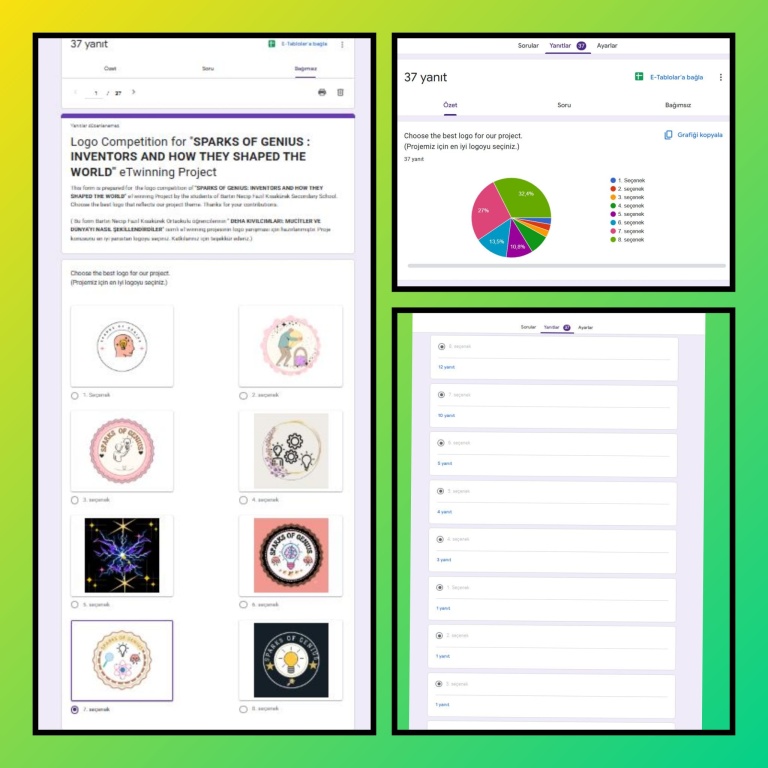 Okulumuz İngilizce öğretmeni Hilal Dinçkal rehberliğinde yürütülen "Sparks of Genius :Inventors and How They Shaped the World" eTwinning projesinin Kasım - Aralık ayı etkinliği olarak öğrencilerimiz "Canva" Web 2.0 aracını kullanarak kendi logolarını hazırlayıp Twinspace 'te bulunan "Padlet" Web 2.0 aracına eklediler. Öğrencilerimizin oluşturduğu logolardan okulumuzu temsil edecek logoyu seçmek için "Google Form" kullanılarak anket hazırlandı. Seçilen logo ile projemizin ortak logosu oluşturuldu.